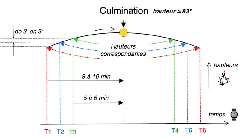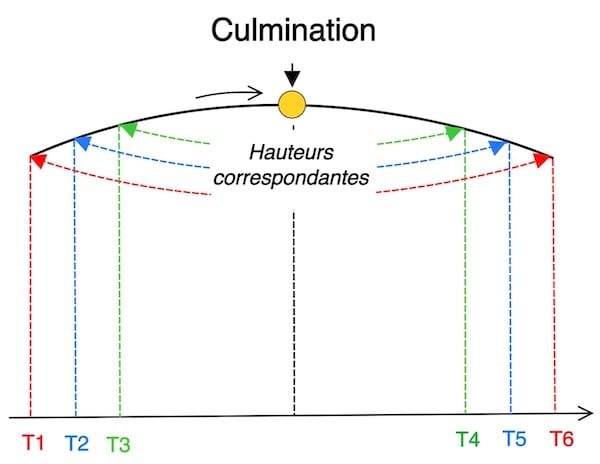Chaque paire d’altitudes égales définit un intervalle de temps symétriquement réparti autour du midi apparent local. Le milieu temporel entre les deux observations correspondantes constitue donc une estimation de l’instant du LAN.