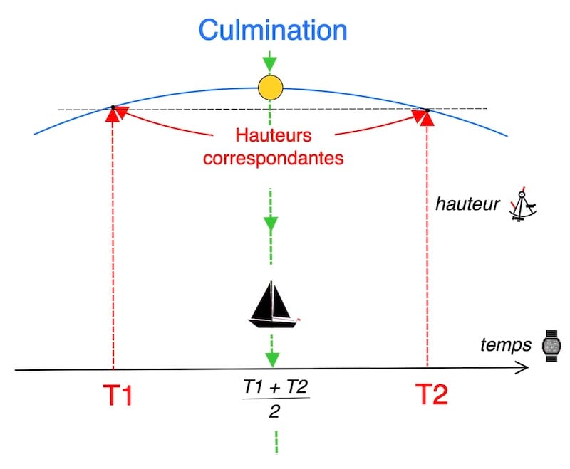 Ces deux hauteurs étant égales, le Soleil est symétriquement disposé par rapport au méridien de l’observateur. Le milieu de temps entre les deux instants d’observation correspond alors au midi-vrai local. On suppose, pour l’instant, que la position du navire est restée inchangée.