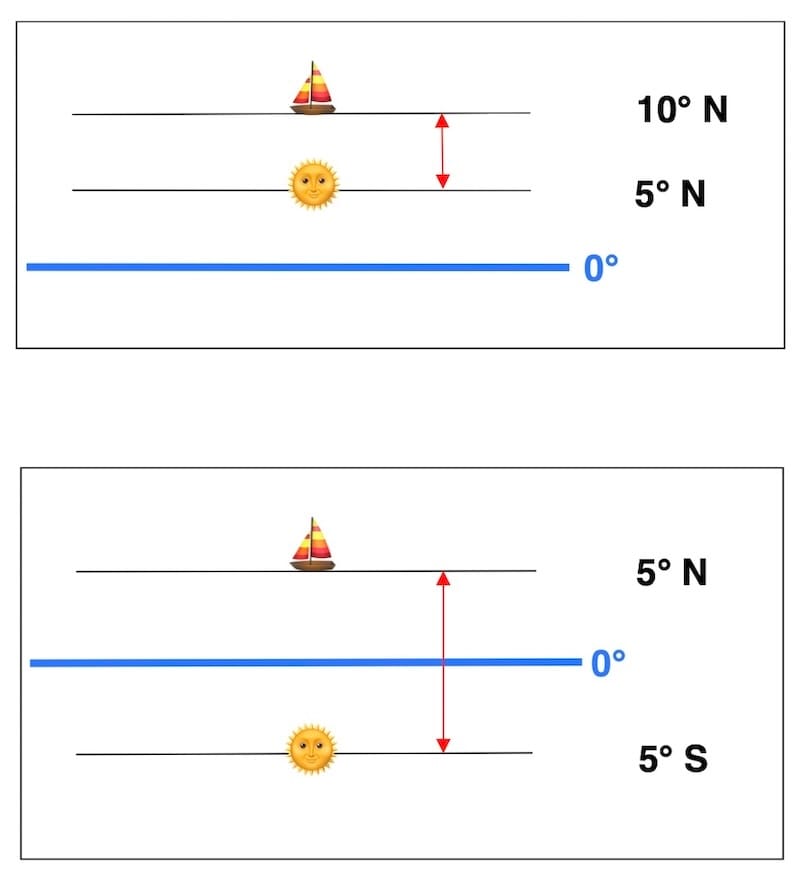 Le signe de la correction Δλ dépend entièrement du sens du déplacement du navire et de la position du Soleil par rapport à la latitude.