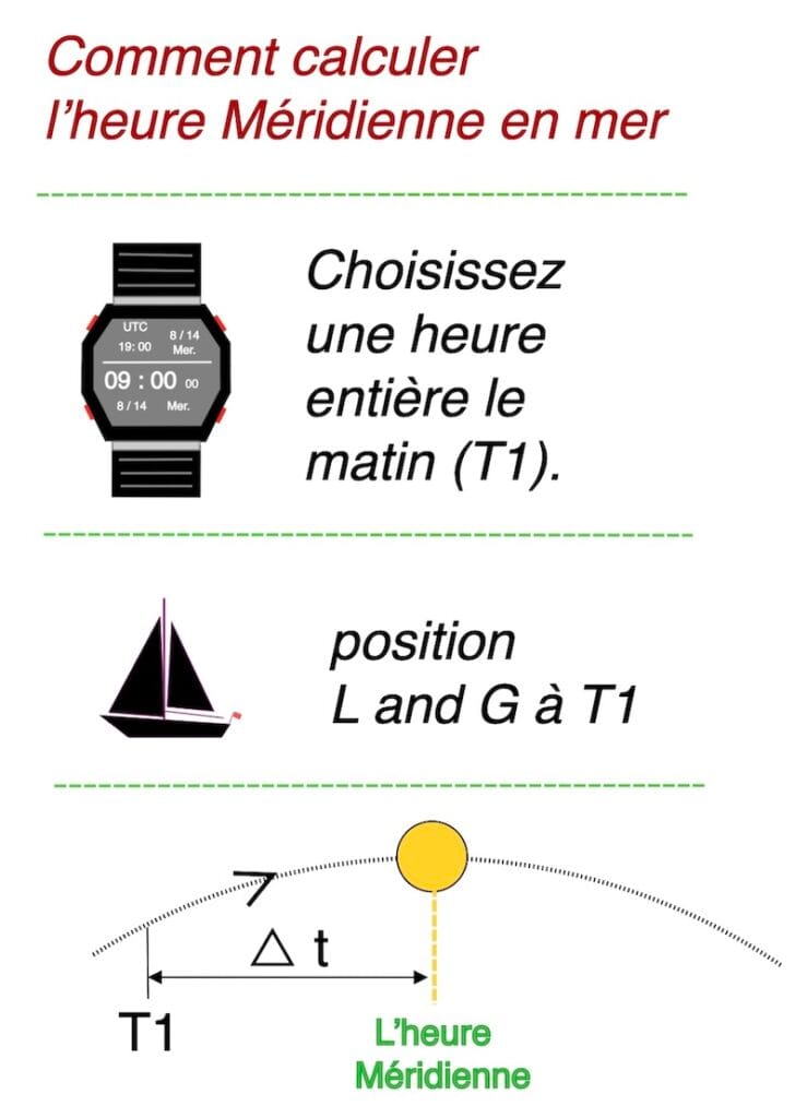 Note : l’écart entre l’heure méridienne exacte et celle calculée avec une estime entachée de l’erreur habituelle de la navigation reste relativement faible, car le déplacement du navire, même à une vitesse de 8 à 10 nœuds, demeure infime comparé au mouvement apparent du Soleil, qui parcourt 15° de longitude par heure.