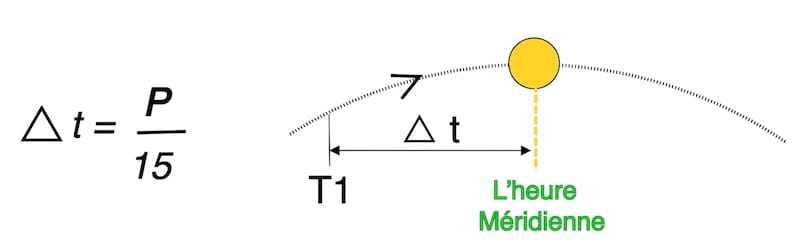 Ainsi, P diminuera jusqu’à zéro à un rythme de 15° par heure, pour s’annuler à l’heure méridienne